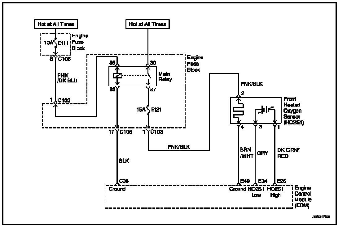 The Engine Control Module (ECM) supplies a voltage of about 0.45 V between terminals E34 and E26 (if measured with a 10 MOhms. digital voltmeter, this may read as low as 0.32 V). The Heated Oxygen Sensor 1 (HO2S1) varies the voltage within a range of about 1 V if the exhaust is rich, down through about 0.10 V if the exhaust is lean. The sensor is like and open circuit and produces no voltage when it is below 315 degrees C (600 degrees F). An open sensor circuit or cold sensor causes Open Loop operation.