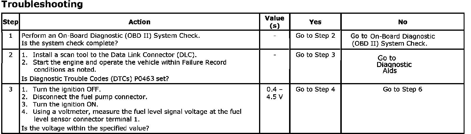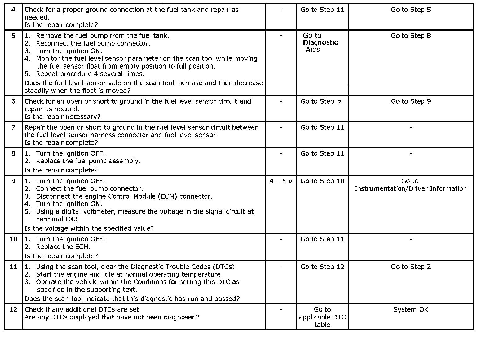 Inspect wiring harness for damage.A stuck fuel level sensor may cause the DTC set.