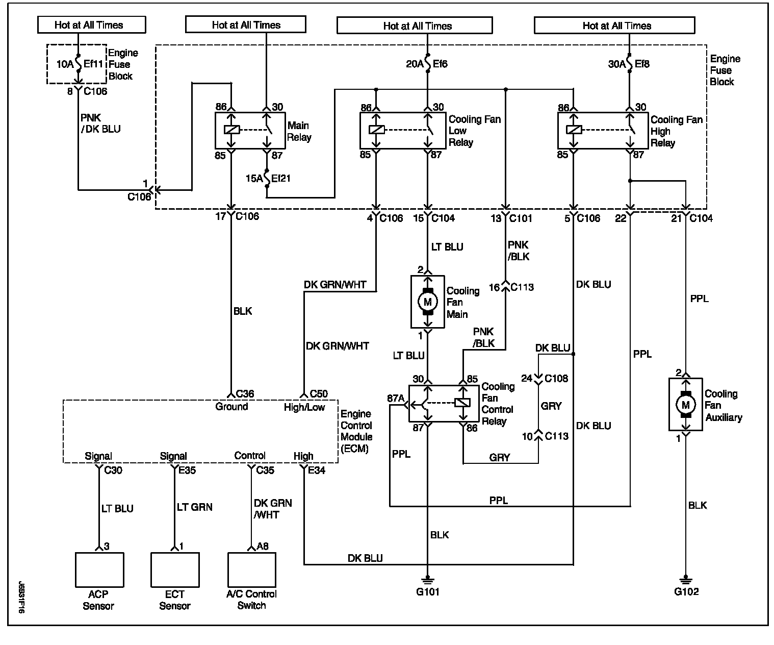 Ignition voltage is supplied directly to the cooling fan relay coil. The Engine Control Module (ECM) controls the relay by grounding the control circuit via an internal switch called a driver. The primary function of the driver is supply the ground for the component being controlled. Each driver has a fault line which is monitored by the ECM. When the ECM is commanding a component ON, the voltage of the control circuit should be low (near 0 V). When the ECM is commanding the control circuit to a component OFF, the voltage potential of the circuit should be high (near battery voltage). If the fault detection circuit senses a voltage other than what is expected, the fault line status will change causing the Diagnostic Trouble Code (DTC) to set.