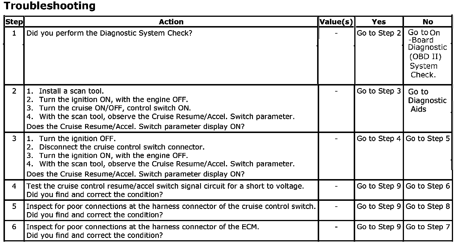 - Ensure that the resume/accel. switch is not stuck or sticking in the engaged position.