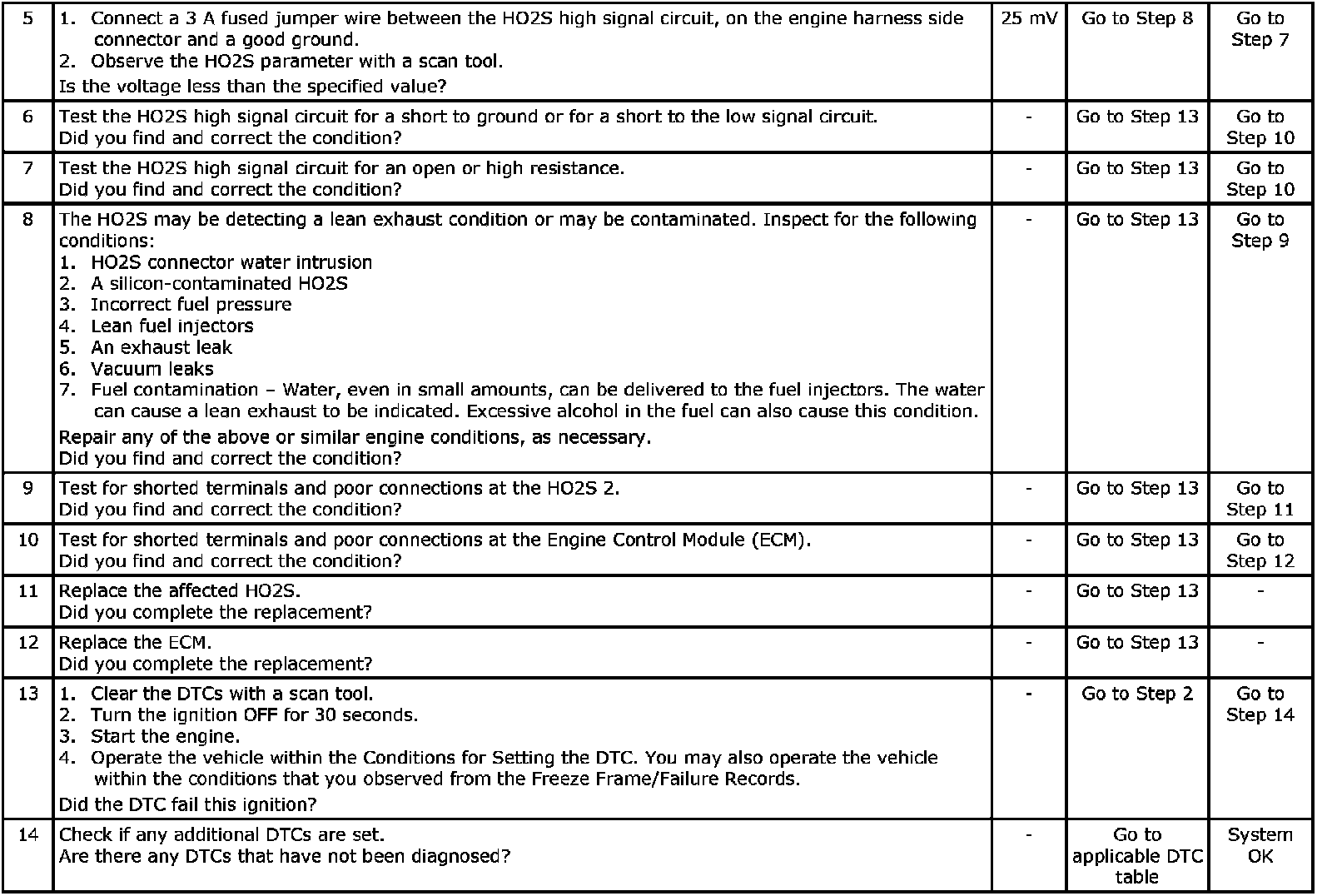 The Heated Oxygen Sensor (HO2S) produces a voltage that varies between 100 - 900 mV under normal operating conditions. The Engine Control Module (ECM) produces a bias voltage on the HO2S signal circuit of 420 - 480 mV. The reference ground for the sensor is provided through the ECM. The ECM monitors the signal voltage to determine if the exhaust is lean or rich. The oxygen sensor voltage is high when the exhaust is rich, and low when the exhaust is lean. The ECM constantly monitors the HO2S signal during the Closed Loop operation. If the ECM detects an HO2S voltage that stays below a specified value during a power enrichment