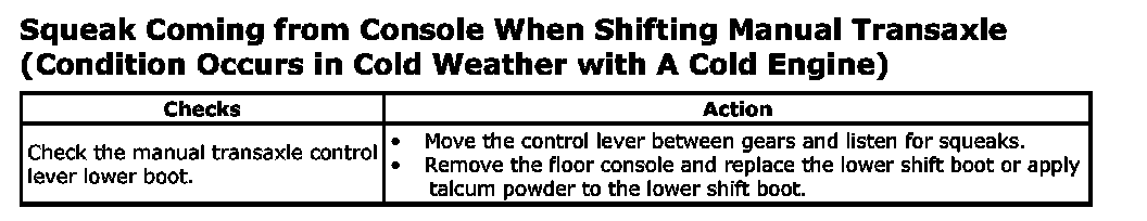 Squeak Coming from Console When Shifting Manual Transaxle (Condition Occurs in Cold Weather with A Cold Engine)