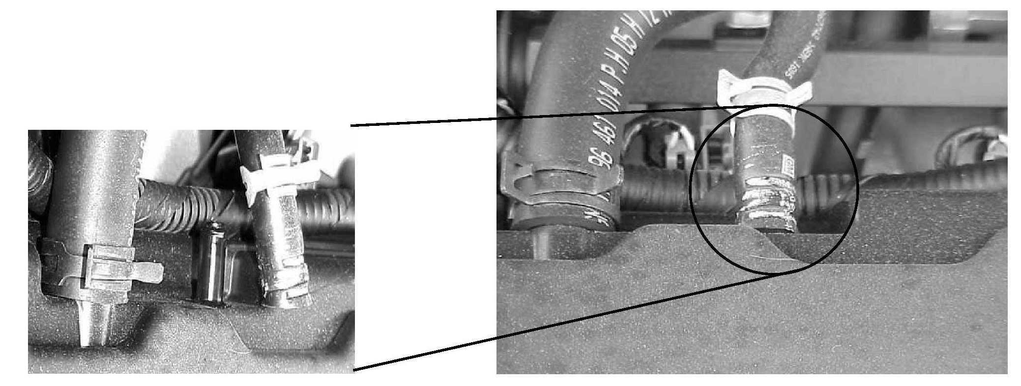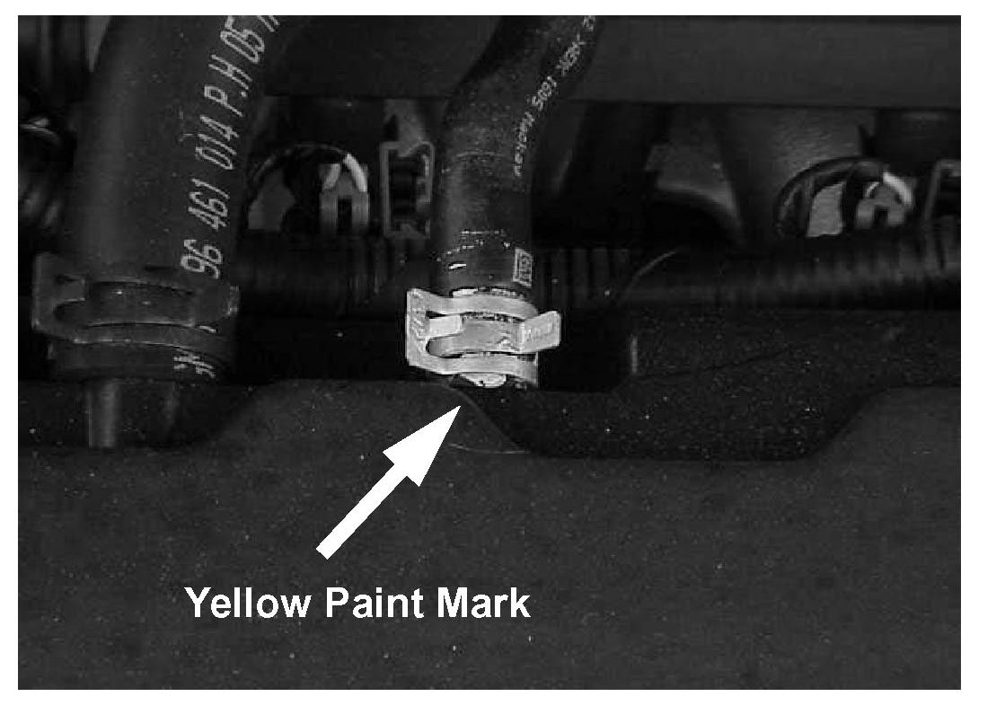^ Check for a yellow paint mark at the cylinder head cover PCV hose connection (refer to figures in steps 5 and 6). If yellow paint is present, no further action is necessary. The cause of this complaint is not related to this TSB; refer to the service manual for further diagnosis.