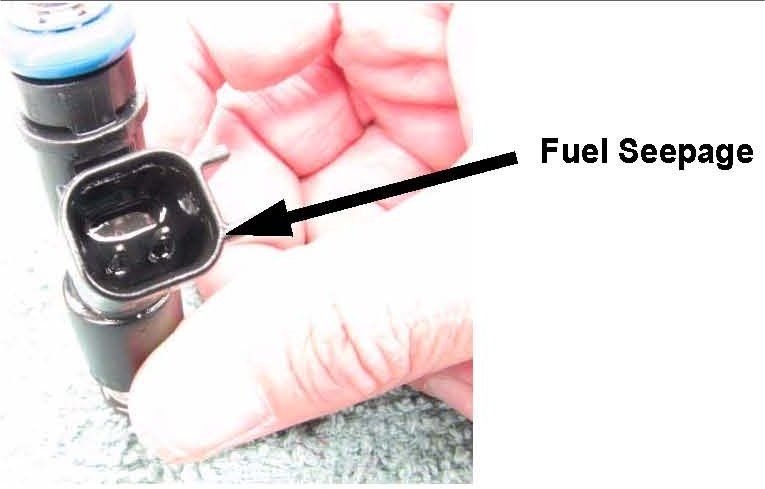 Fuel injector(s) may have a very small amount of seepage where the electrical terminals exit the injector housing for the electrical connection. The leak, if present, is small and may be difficult to detect by visual inspection without removing the injector electrical connector.