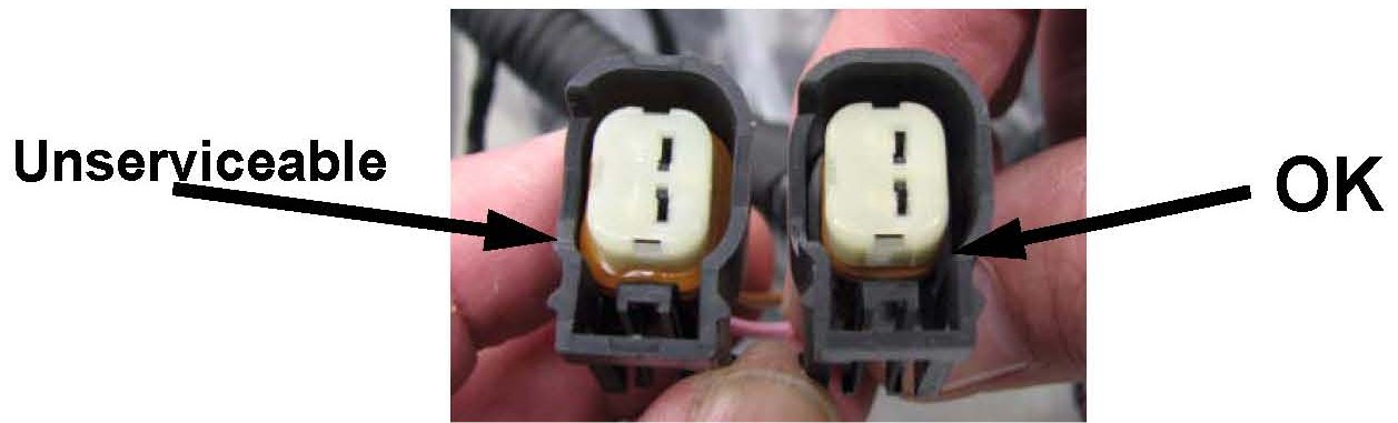 3. Inspect all injector connectors inside for evidence of fuel exposure. If any signs of fuel leakage are found in one injector, replace four(4) fuel injectors. See above picture.