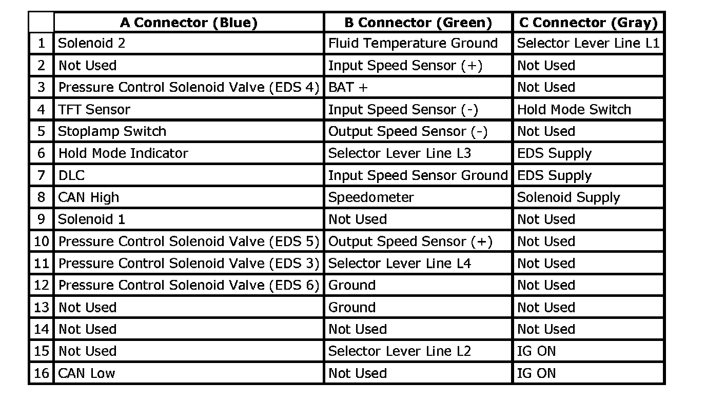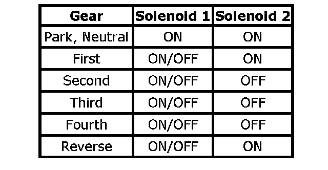 The TCM monitors numerous inputs to determine the appropriate solenoid state combination and transaxle gear for the vehicle operating conditions.