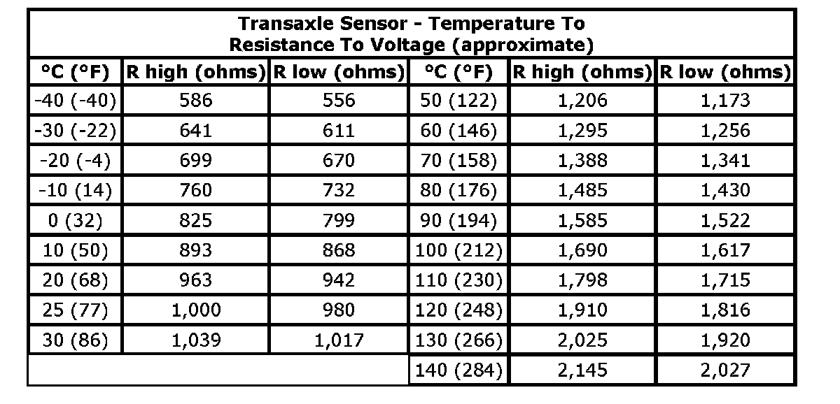 The internal electrical resistance of the sensor varies in relation to the operating temperature of the transaxle fluid (see chart).