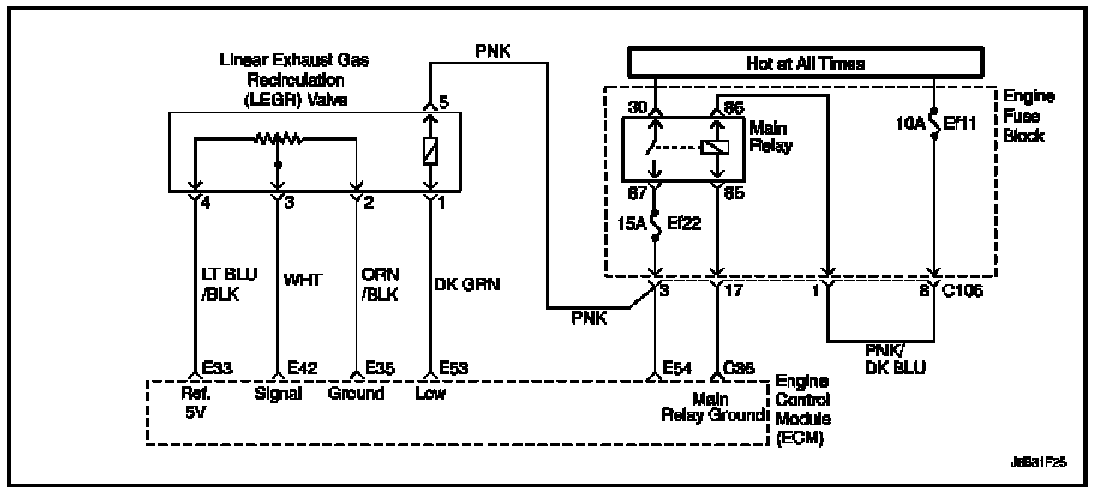 The ECM monitors the results of its command through a feedback signal. By sending a 5 volt reference and a ground to the EGR valve, a voltage signal representing the EGR valve pintle position is sent to the ECM. This feedback signal can also be monitored on a scan tool and is the actual position of the EGR pintle. The Actual EGR Position should always be near the commanded or Desired EGR Position. This diagnostic Trouble Code (DTC) will detect short circuit.