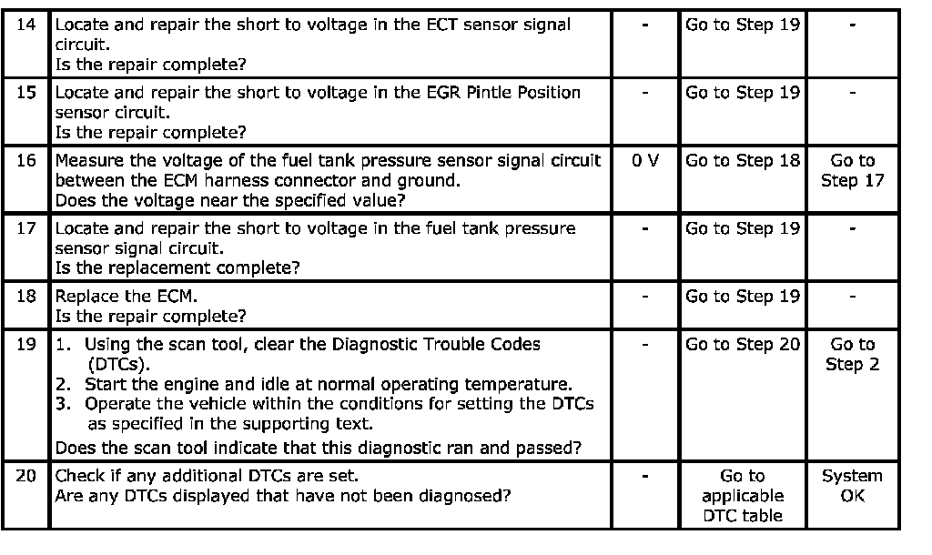 3. If a sensor input circuit has been shorted to voltage, ensure that the sensor has not been damaged. A damaged IAT or ECT sensor will continue to indicate a high voltage or low temperature after the affected circuit has been repaired. A damaged ACT, TP, MAP, Fuel Tank Pressure, or EGR Pintle Position sensor will indicate a high or low voltage or may be stuck at a fixed value after the affected circuit has been repaired. If the sensor has been damaged, replace it.