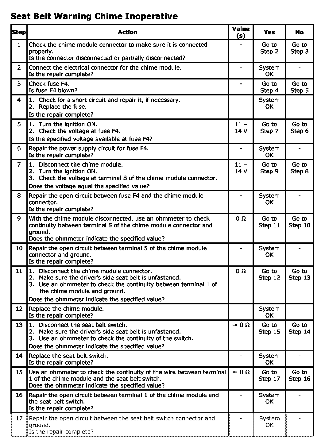 Seat Belt Warning Chime Inoperative