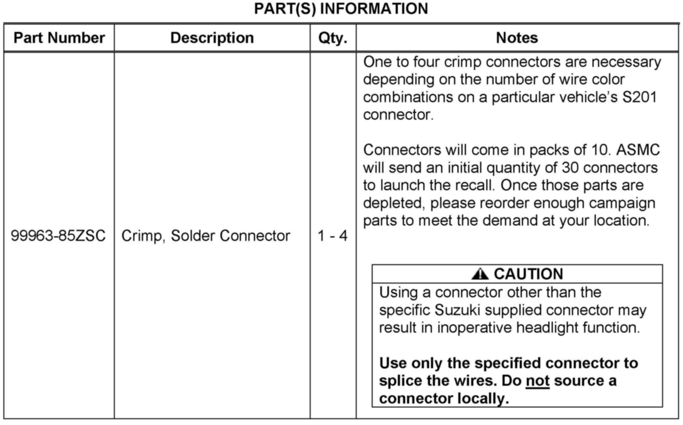 CORRECTION: Suzuki dealers are requested to remove the S201 splice pack and then re-join related wiring with the special crimp/solder style splice connectors (part # 99963-85ZSC).