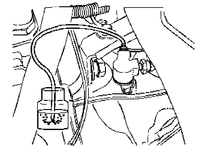 1. Attach a vinyl hose to the bleeder plug. Place the other end of the vinyl tube in a glass container half-filled with brake fluid.