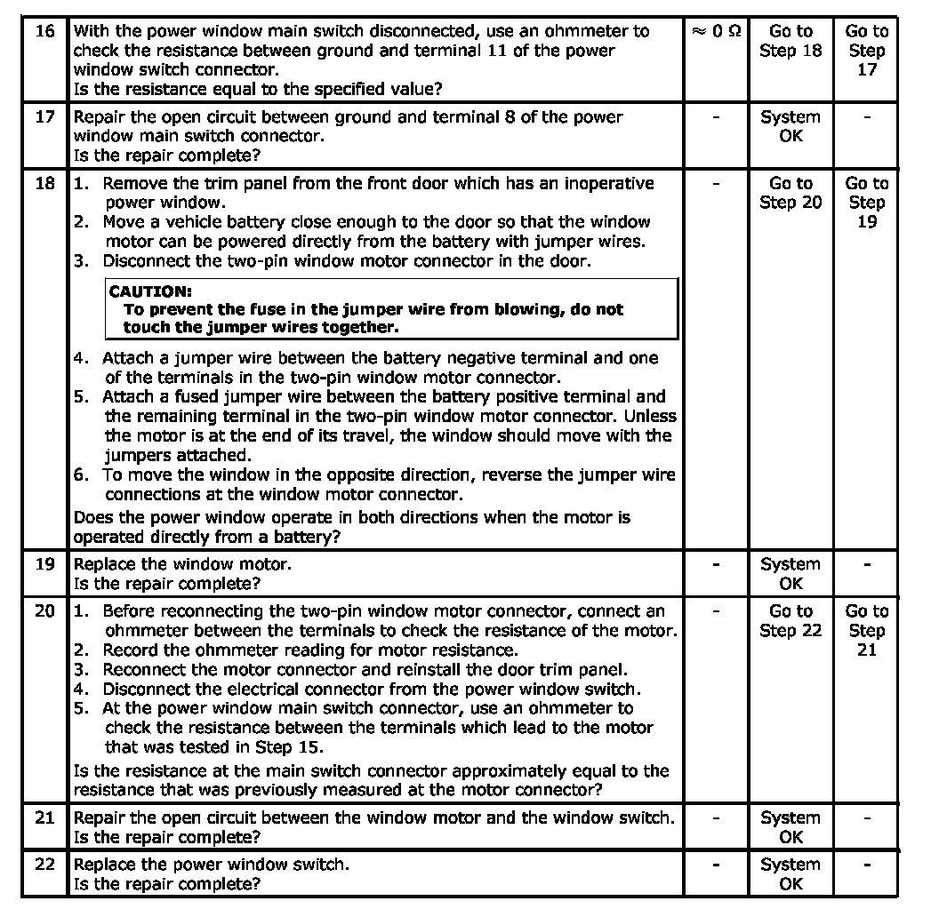 CAUTION: When powering the window motors directly from a battery with jumper wires, make sure one of the jumper wires contains a fuse. If the jumpers are accidentally touched together, the fuse will prevent sparking and burns from sudden terminal heating.