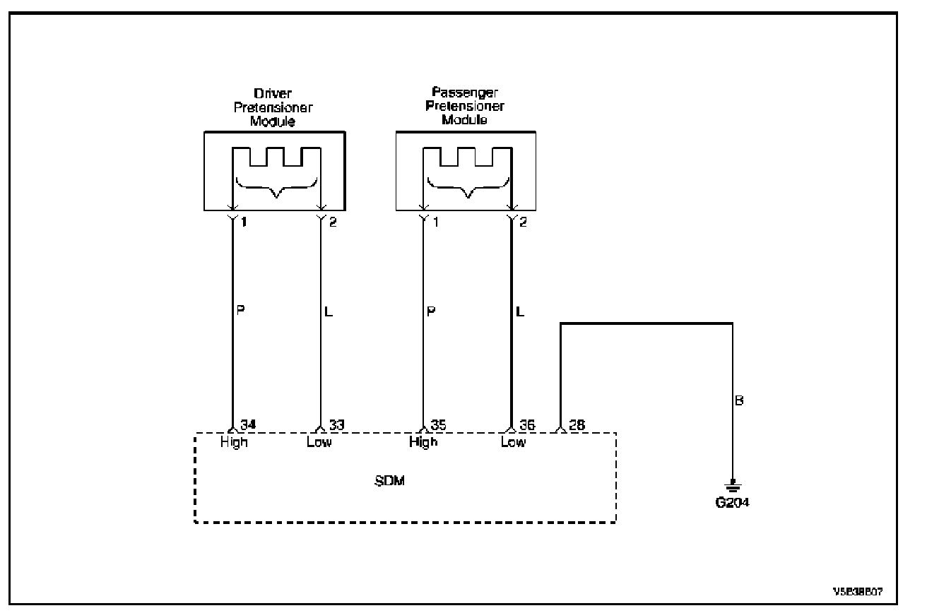 The SDM checks the wiring connection to the passenger belt pretensioner module by letting the infinitesimal current flow through the internal circuit and verify the resistance.