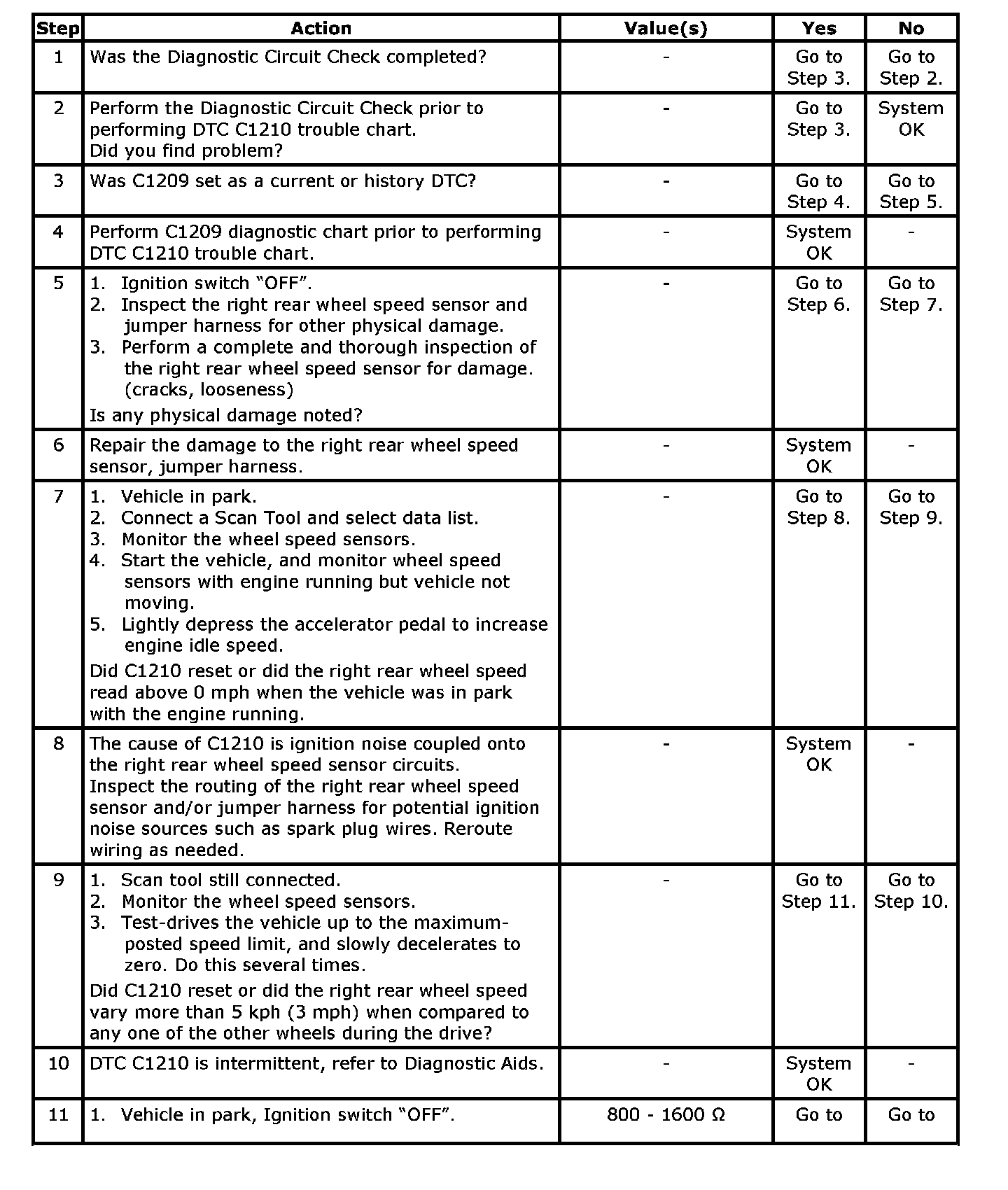 A careful visual inspection of the wheel speed sensor for damaged such as cracks should be performed. If the DTC sets at the same speed every drive cycle, the wheel speed sensor is most likely damaged. Failure to perform the previous steps carefully and fully can result in misdiagnosis, unnecessary component replacement and reoccurrence of DTC C1210.