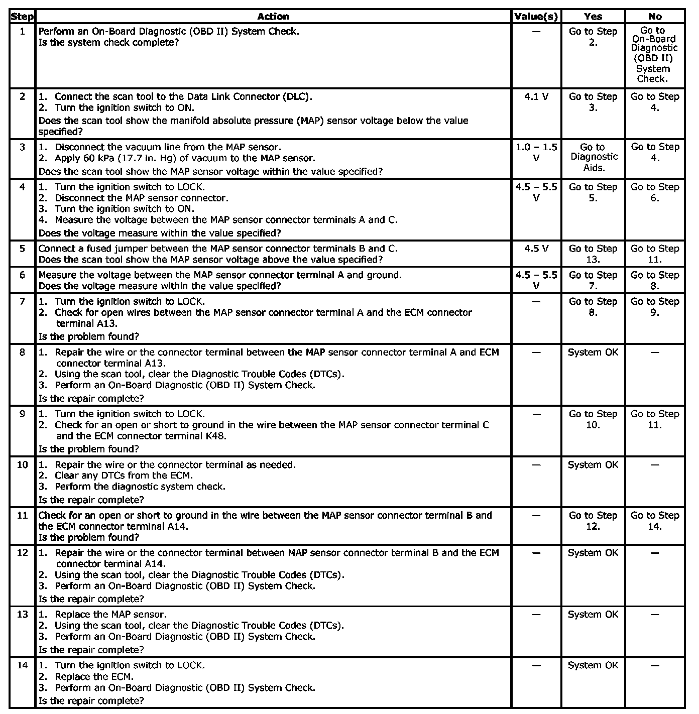 With the ignition ON and the engine stopped, the manifold pressure is equal to atmosphere pressure and the signal voltage will be high. The ECM as an indication of vehicle altitude uses this information. Comparison of this reading with a known good vehicle with the same sensor is a good way to check the accuracy of a suspect sensor. Readings should be the same 0.4 V. If a DTC P0107 is intermittent, refer to Manifold Absolute Pressure Check for further diagnosis. Testing and Inspection
