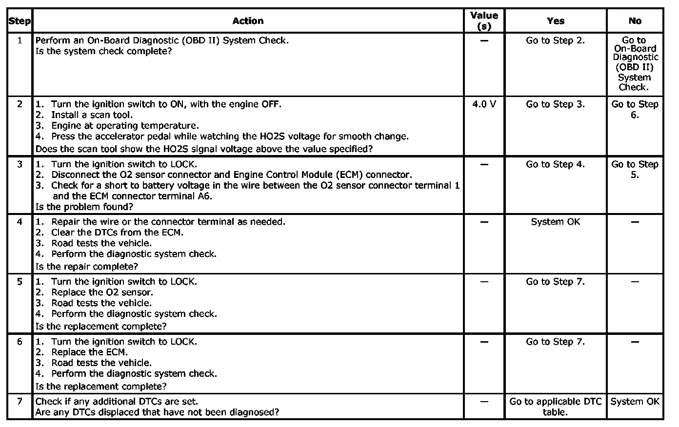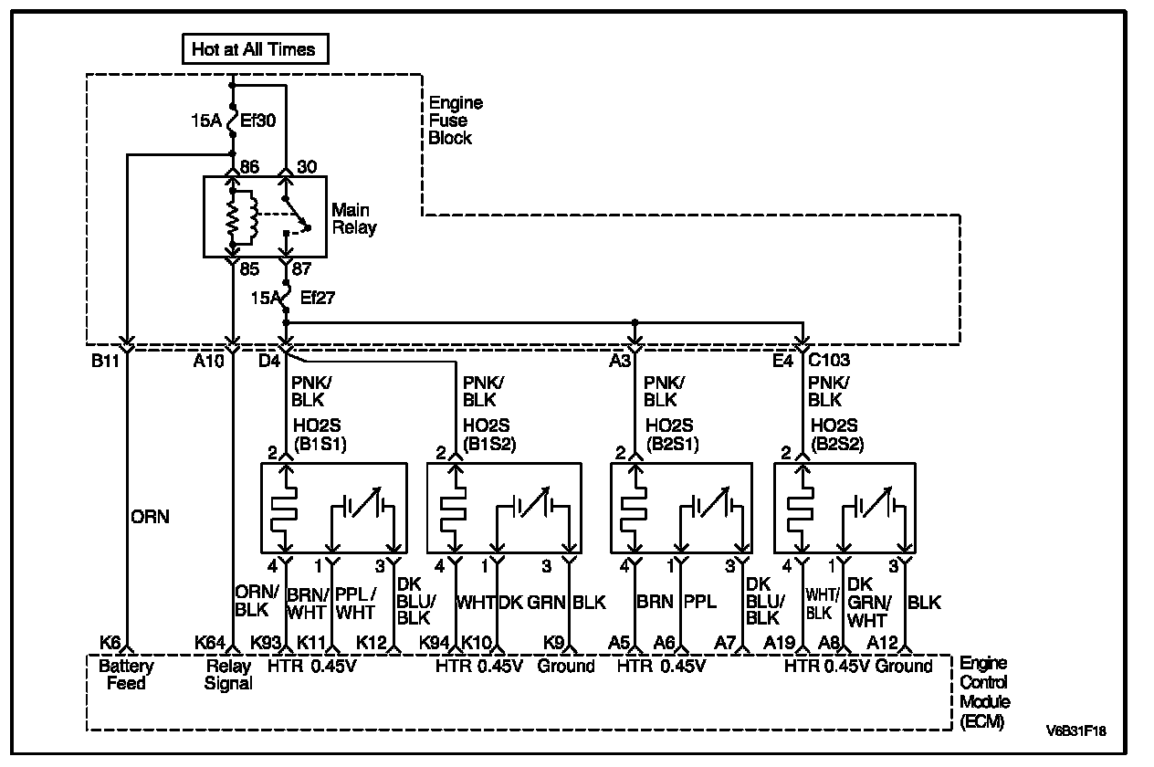 The Engine Control Module (ECM) supplies a voltage of about 0.45 V between the ECM terminals A6 and A7. The Oxygen (O2) sensor varies the voltage within a range of about 1 V if the exhaust is rich, down to about 0.1 V if the exhaust is lean. The O2 sensor is like an open circuit and produces no voltage when it is below 360 degrees C (680 degrees F). An open O2 sensor circuit or a cold O2 sensor causes "Open Loop" operation.