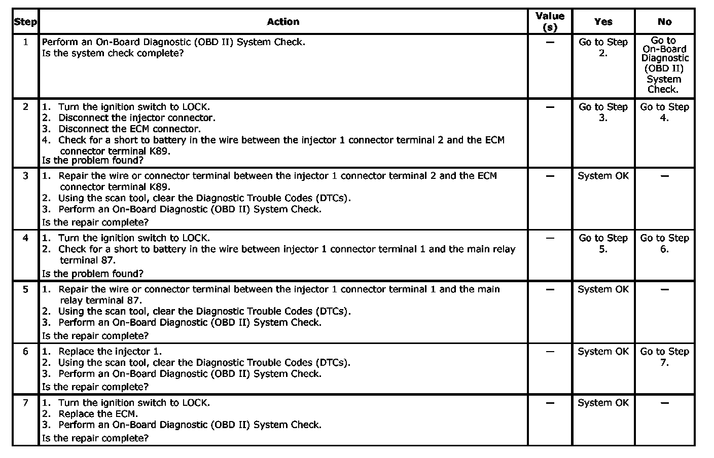 The Engine Control Module (ECM) has 6 individual injector driver circuits, each of which controls an injector. When a driver circuit is grounded by the ECM, the injector is activated. The ECM monitors the current in each driver circuit. The ECM measures a voltage drop through a fixed resistor and controls it. The voltage on each driver is monitored to detect a fault. If the voltage is not what the ECM expects to monitor on the circuit, a DTC is set. This DTC detects a high voltage and/or a short to battery voltage conditions.