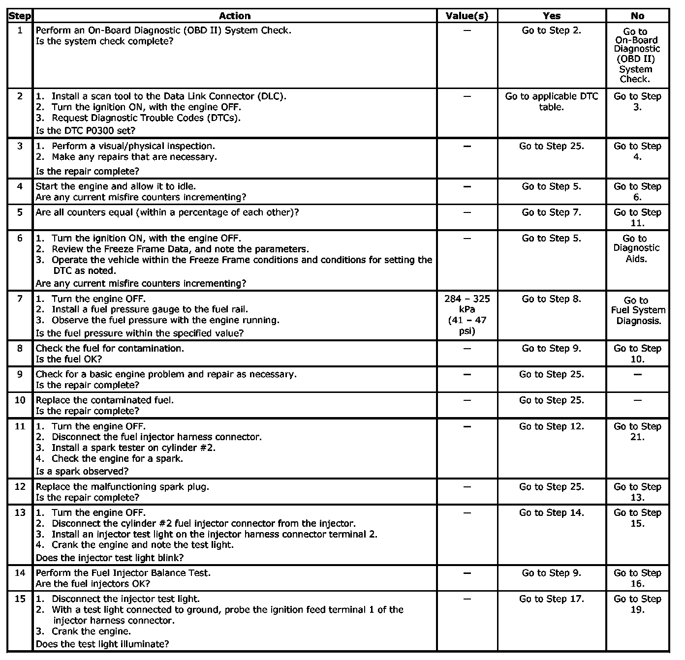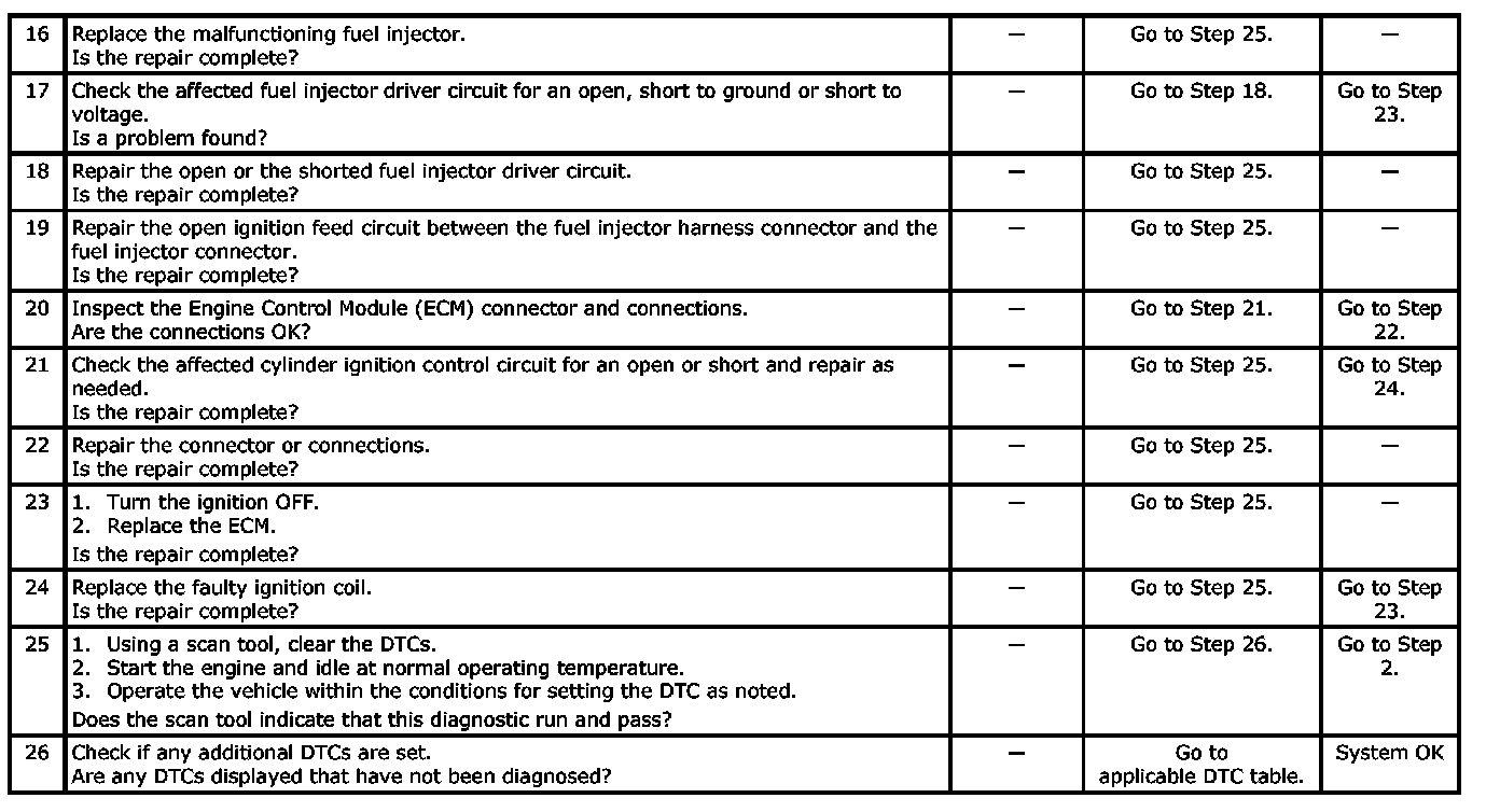 The Engine Control Module (ECM) monitors the crankshaft and camshaft positions to detect if the engine is misfiring. The ECM looks for a quick drop in crankshaft speed. This test is executed in blocks of 100 engine revolution tests. It may take between one to several tests to store a DTC and illuminate the Malfunction Indicator Lamp (MIL). Under light misfire conditions, it may also take more than one trip to set a DTC. Severe misfire will flash the MIL, indicating that catalyst damage is possible.