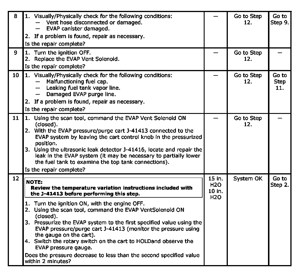 The EVAP emission system is checked by applying vacuum to the EVAP emission system and monitoring for a vacuum decay. The Engine Control Module (ECM) monitors the vacuum level through the fuel tank pressure sensor signal. At the appropriate time, the EVAP emission canister purge valve and the EVAP emission vent solenoid are turned ON, allowing the engine to draw a small vacuum on the entire evaporative emission system. After the desired vacuum level has been achieved, the EVAP emission canister purge valve is turned OFF, sealing the system. A leak is detected by monitoring for a decrease in the vacuum level over a given time period, when all other variables remain constant. A small leak in the system will cause DTC P0442 to be set.