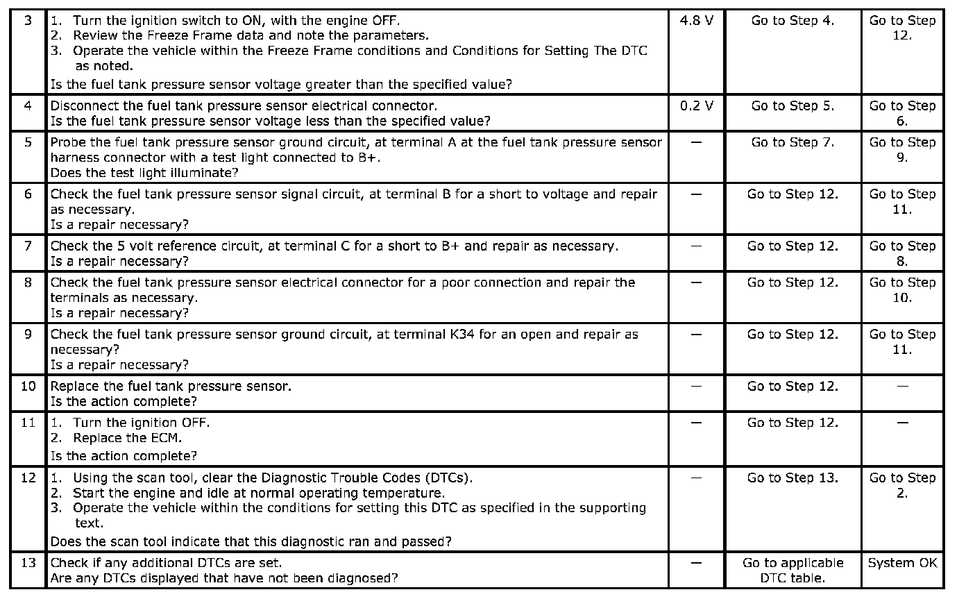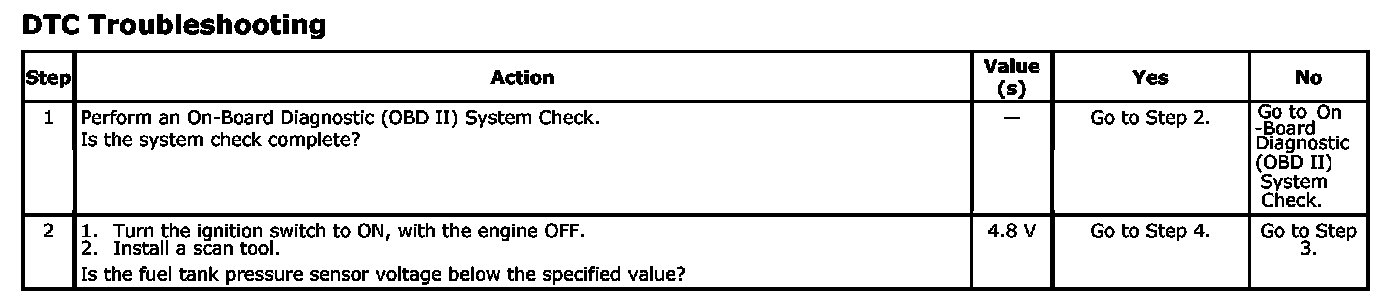 The EVAP emission system is checked by applying vacuum to the EVAP emission system and monitoring for a vacuum decay. The Engine Control Module (ECM) monitors the vacuum level through the fuel tank pressure sensor signal. At the appropriate time, the EVAP emission canister purge valve and the EVAP emission vent solenoid are turned ON, allowing the engine to draw a small vacuum on the entire EVAP emission system. After the desired vacuum level has been achieved, the EVAP emission canister purge valve is turned OFF, sealing the system. The ECM supplies a 5 volt reference signal and a ground to the Fuel Tank Pressure sensor. The fuel tank pressure sensor sends a voltage signal back to the ECM relative to the fuel tank pressure. The voltage signal will vary from 0.2 - 4.8 V.