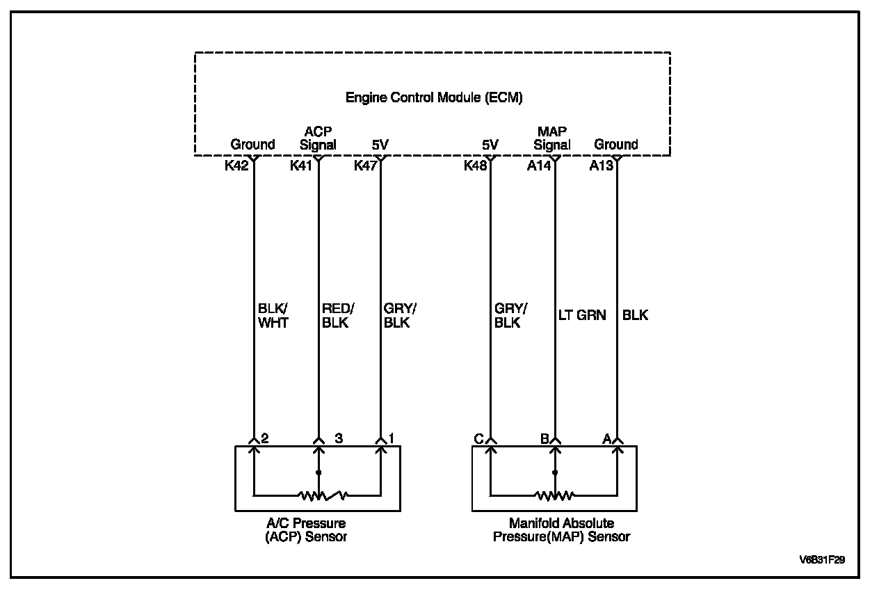 The Air Conditioning Pressure (ACP) sensor operates like other 3-wire sensors. The ECM applies a 5 volt reference and a sensor ground to the sensor. Changes in the A/C refrigerant pressure will cause the ACP sensor input to the ECM to vary. The ECM monitors the ACP sensor signal circuit and can determine when the signal is outside of the possible range of the sensor. When the signal is out of range for a prolonged period of time, the ECM will not allow the A/C compressor clutch to engage. This is done to protect the compressor.
