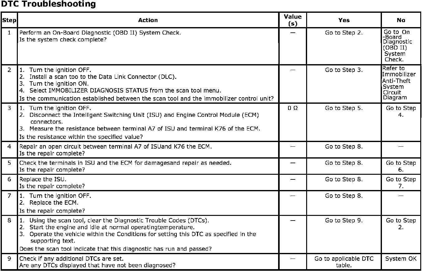 When the ignition switch is turned to ON, the key tested by immobilizer anti-theft system. While the key code is being read by immobilizer control unit or integrated anti-theft control unit, the engine can start run with any key that will turn the lock cylinder. the key code is read and compared with key codes that have been stored in the memory of the immobilizer control unit. If a valid key is detected, the immobilizer control unit sends a serial data release message to the Engine Control Module (ECM). Included in the release message is an Identification (ID) code which assures that neither the immobilizer control unit nor the ECM have been substituted to defeat the system. If the ECM receives an invalid release message, the ECM performs the following action: