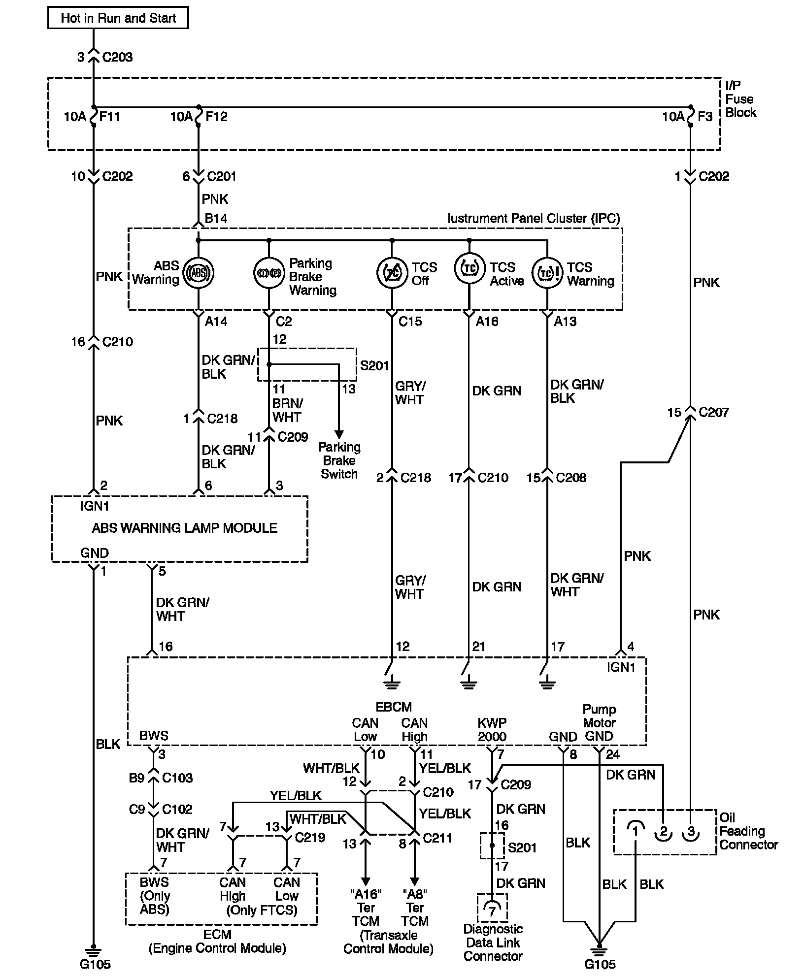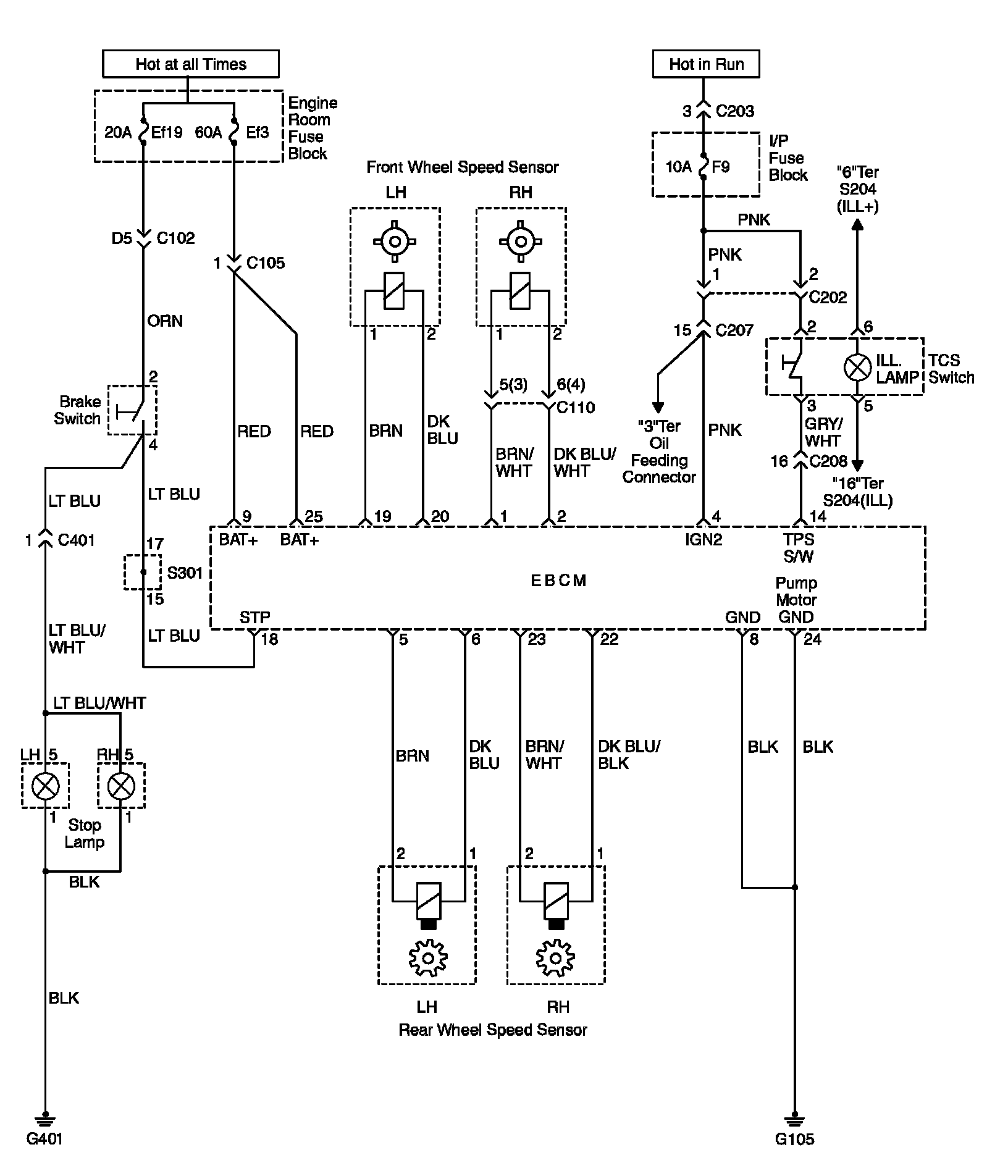 Serial Data is transmitted/received by the EBCM through terminal 7. The EBCM is supplied with constant battery feed voltage through terminals 9 and 25, and switched ignition voltage through terminal 4. The EBCM ground is provided through terminal 8 and 24.