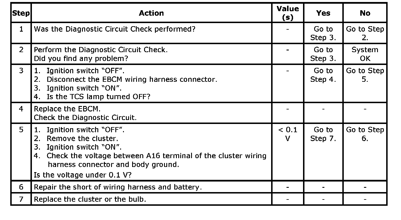 Typical cause of the TCS Lamp ON with no DTC(s) set is mainly EBCM wiring harness short to battery.