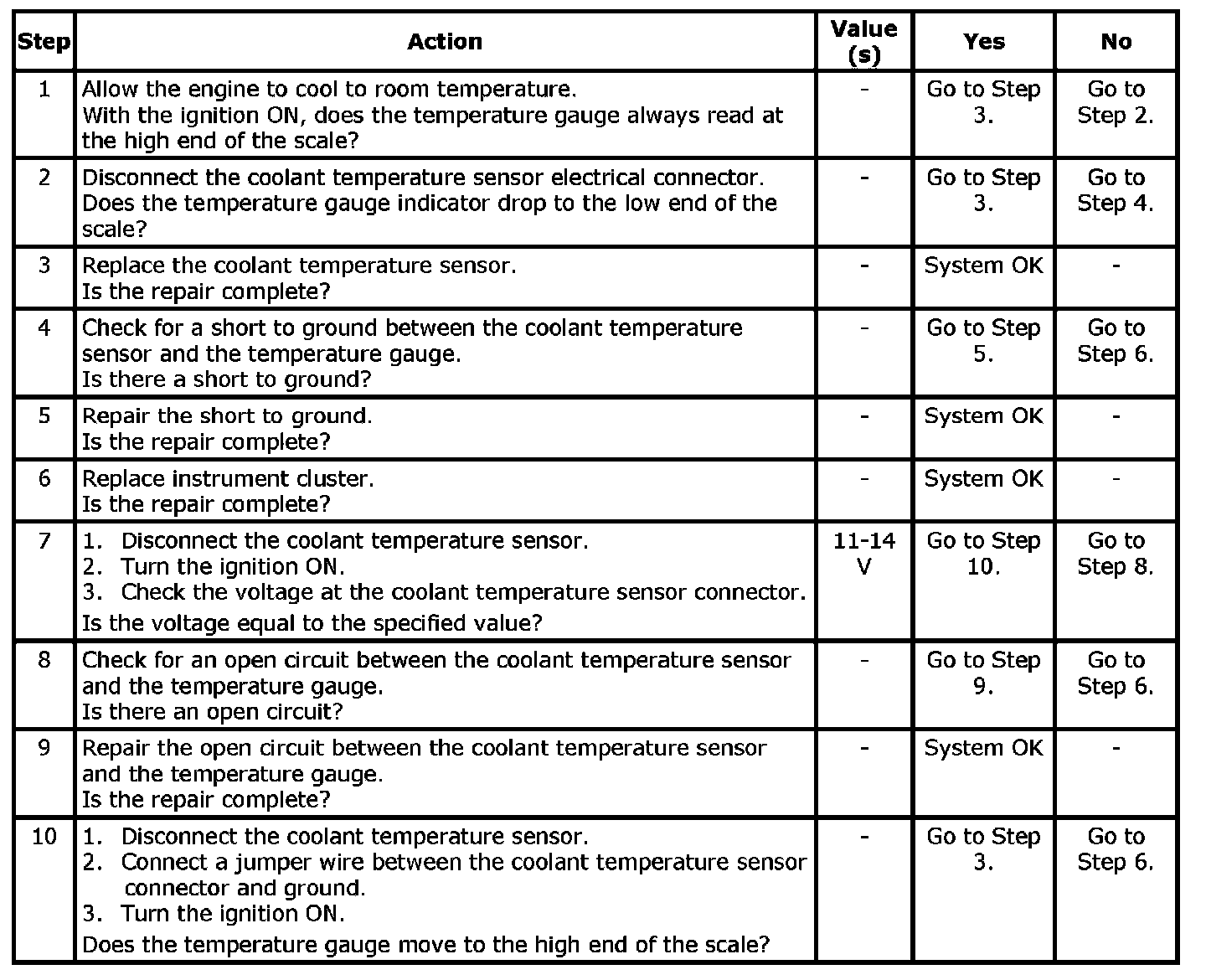 1. Begin the diagnostic table at Step 1 if the problem is that the temperature gauge always indicates full. Begin the diagnostic table at Step 7 if the problem is that the temperature gauge always indicates empty.