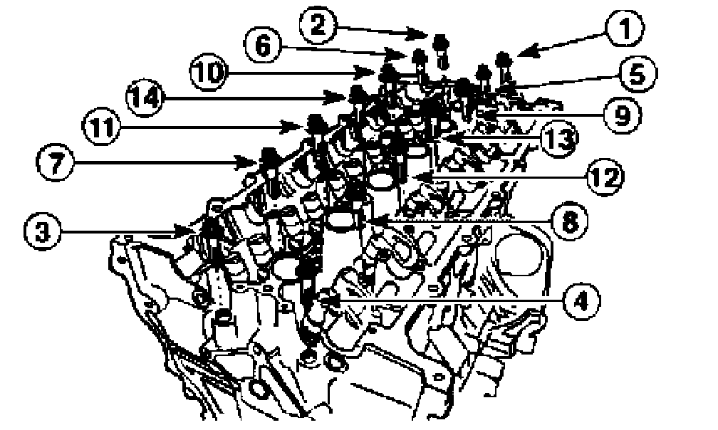 22. Remove the cylinder head bolts in the sequence shown and the cylinder head.