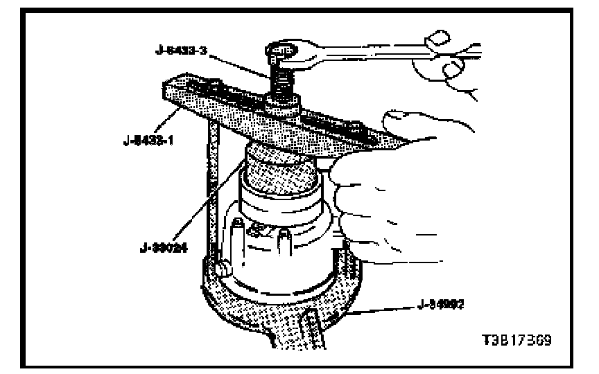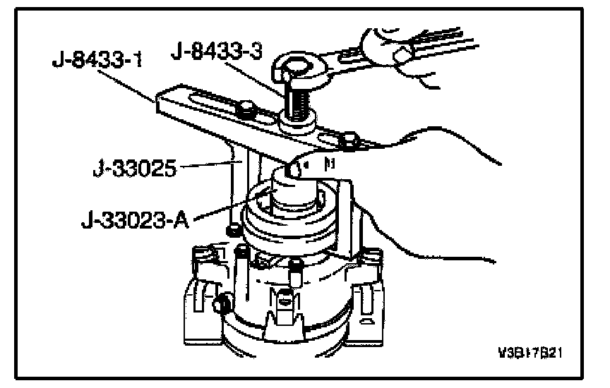 8. Tighten the forcing screw J-8433-3 against the puller pilot J-33023-A to remove the clutch coil.