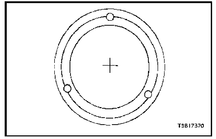 5. When the clutch coil is fully seated on the compressor housing, use a 3 mm (1/8 inch) diameter drift punch and stake the housing at three places, 120 degrees apart, to ensure that the clutch coil will remain in position. Stake point size should be only one-half the area of the punch tip and approximately 0.28 to 0.35 mm (0.010 to 0.015 inch) deep.