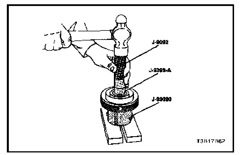 2. Align the new bearing squarely in the pulley bore. Use the bearing installer J-9481 and the driver handle J-8092, drive the bearing fully into the pulley bore.