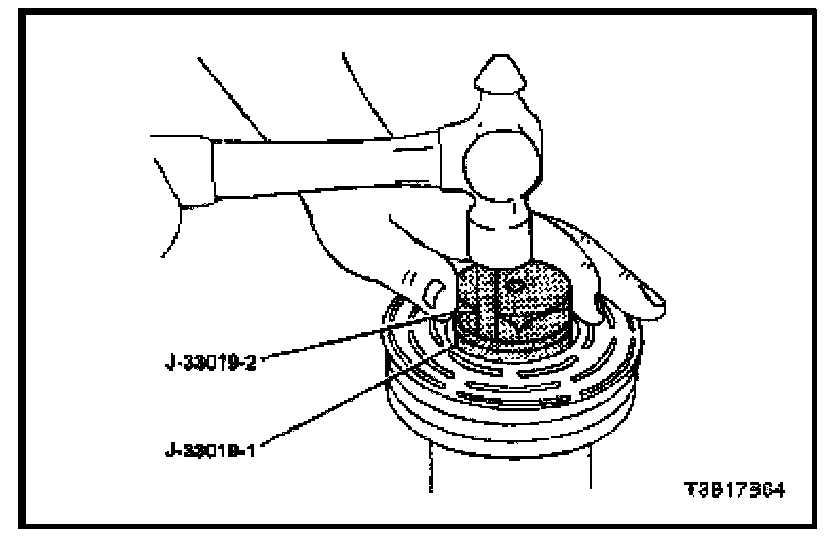 3. Place the bearing staking guide J-33019-1 and the bearing staking pin J-33019-2 in the rotor hub core. Shift the rotor and bearing assembly on the block to give full support to the hub under the staking pin. A heavy-duty rubber band may be used to hold the staking tool pin in the guide. The pin should be properly positioned in the guide after each impact on the pin.