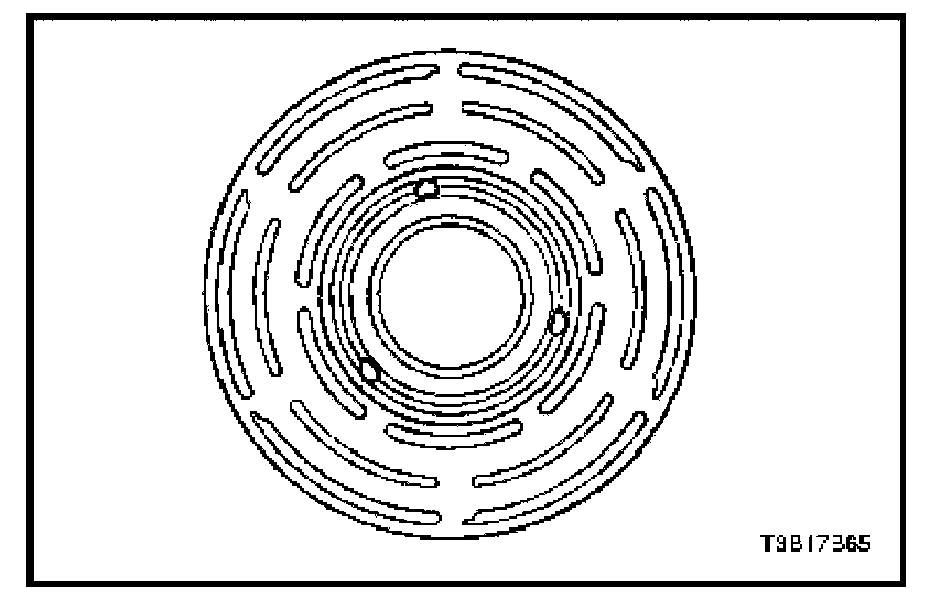 6. With the compressor mounted to the compressor holding fixture J-34992, install the pulley puller J-33020 into the inner circle of slots in the pulley rotor. Turn the pulley puller J-33020 clockwise in the slots to engage the puller tangs with the segments between the slots in the rotor.