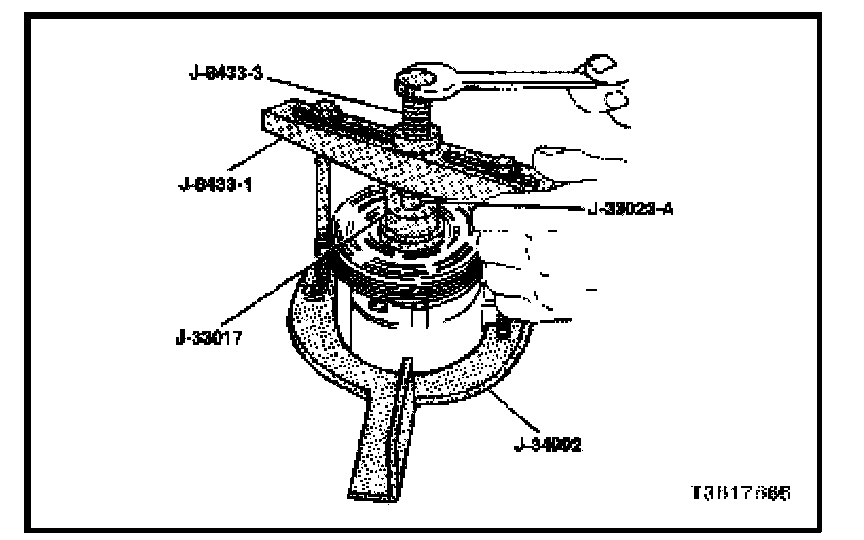 7. Position the puller crossbar J-8433-1 center forcing bolt on the puller pilot J-33023-A and assemble the two through-bolts and the washers through the slots on the puller crossbar J-8433-1. Thread the through-bolts into the holding fixture J-34992. The thread of the throughbolts should engage the full thickness of the fixture.