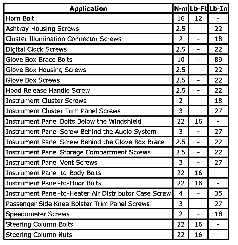 Instrument Panel, Gauges and Warning Indicators: Specifications