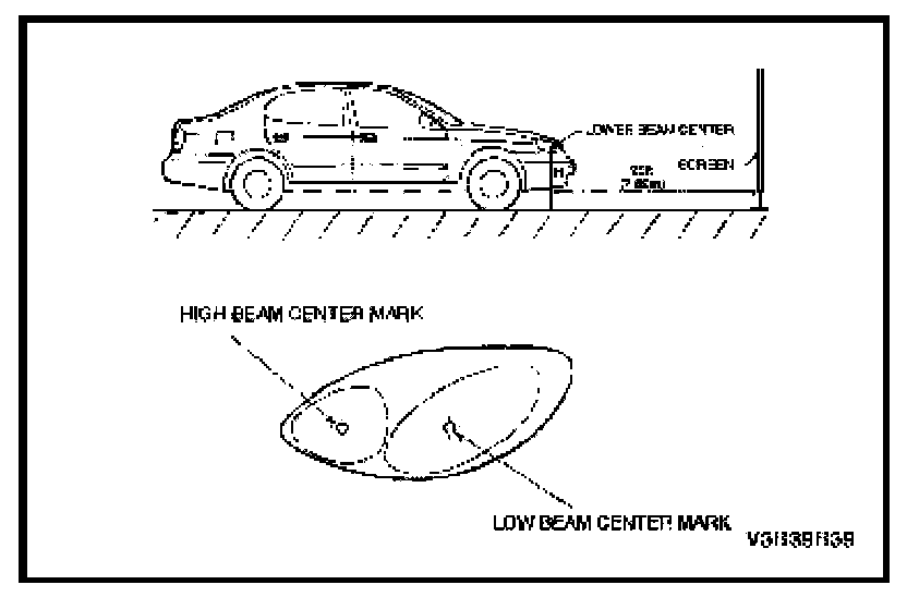 - Find the low beam center mark on the lens of the lamps and measure the height (H) from ground to the low beam center mark. The low beam center mark is on the surface of the lens more outer than the high beam center mark.