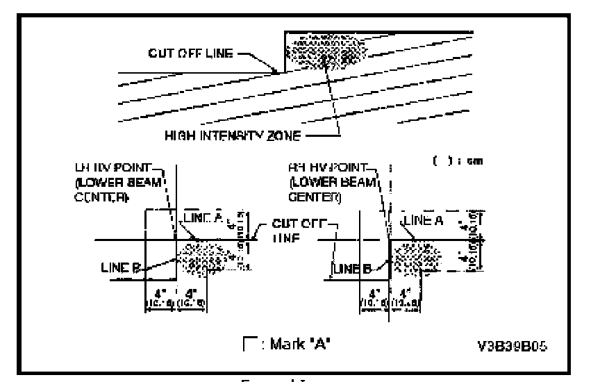 3. Adjust the horizontal aiming driver with a "+" screw driver so that LINE B (vertical line of cut off line) shall be placed within 4 in. (100 mm) right and left from the vertical axis of HV point.