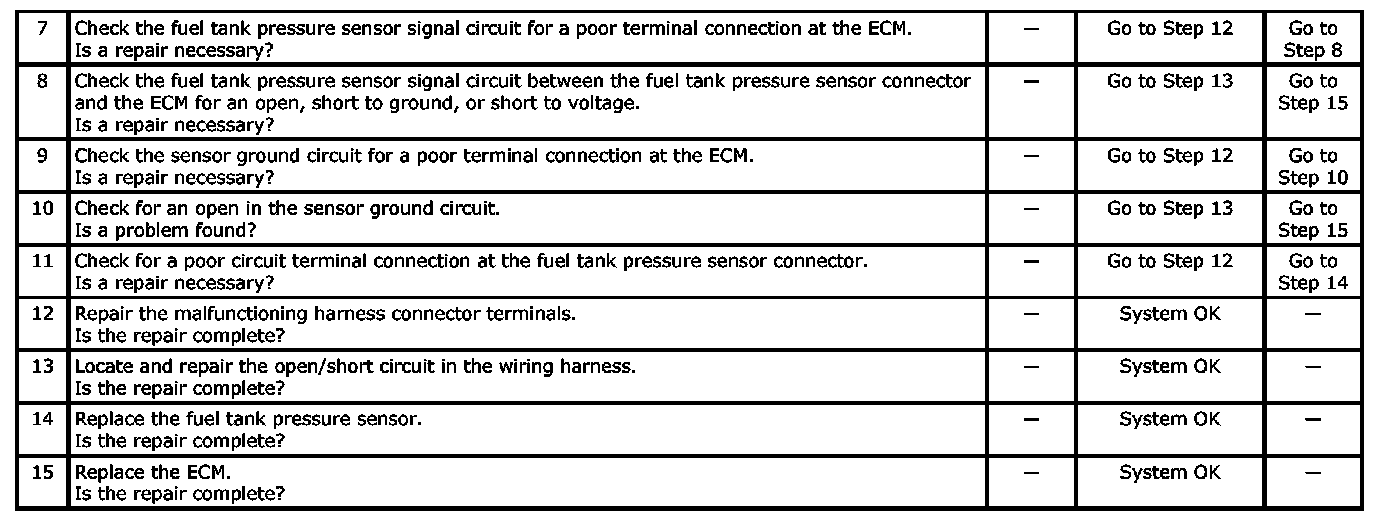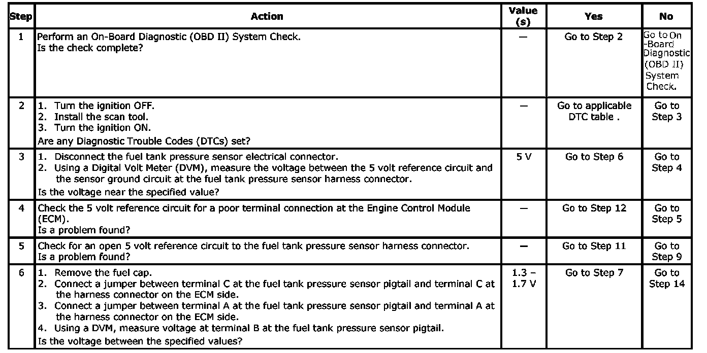 - Damaged harness. Inspect the wiring harness for damage. If the harness appears to be OK, observe the Fuel Tank Vacuum Pressure display on the scan tool while moving connectors and wiring harnesses related to the sensor. A change in the display will indicate the location of the fault.