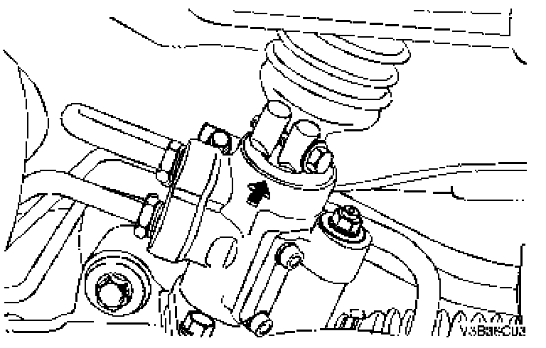 1. Install the rack and pinion assembly from below. The steering gear must be in a straight ahead position, and the steering wheel spokes must be vertical and pointing to the left. Align the marks on the shafts to ensure proper positioning. Seat the stub shaft into the intermediate shaft.
