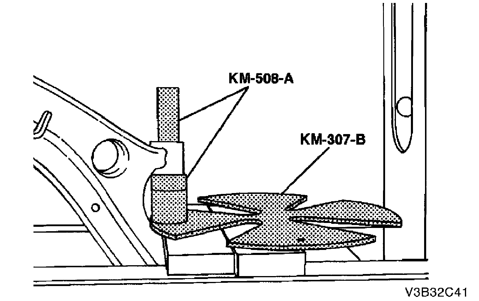2. Remove the control arm rear bushing using a press, the removal plate KM-307-13, and a drift.