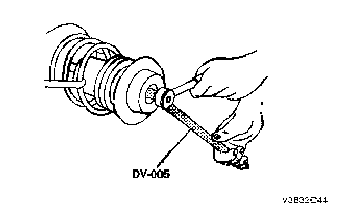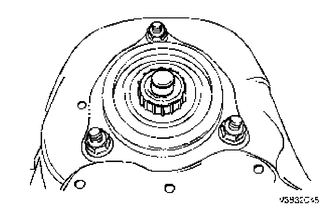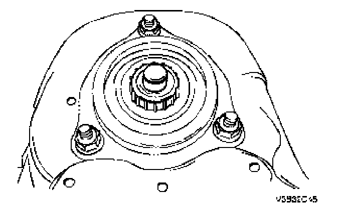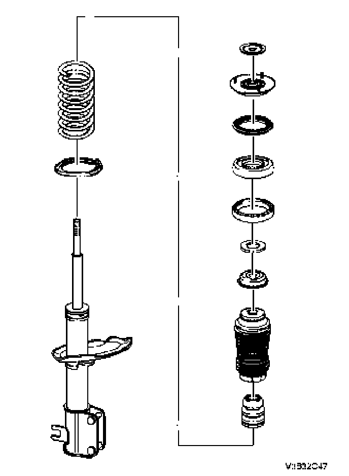 3. Install the piston rod boot, the hollow bumper, the upper spring insulator, the upper spring seat, the upper strut mount, and the mount bearing. Be sure the front spring seat is positioned correctly.