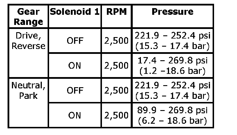 9) Compare data to the Drive-Park-Neutral line pressure chart below.