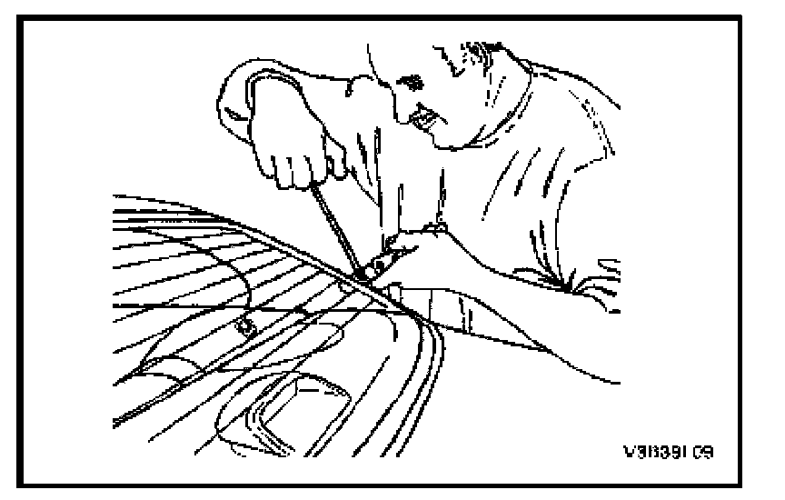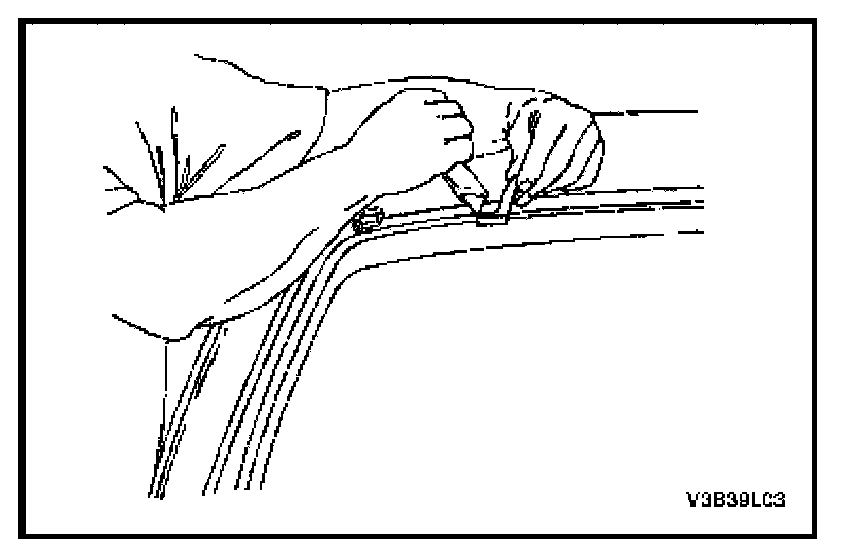 4. Using the glass sealant remover J-24402, cut the adhesive around the rear window.