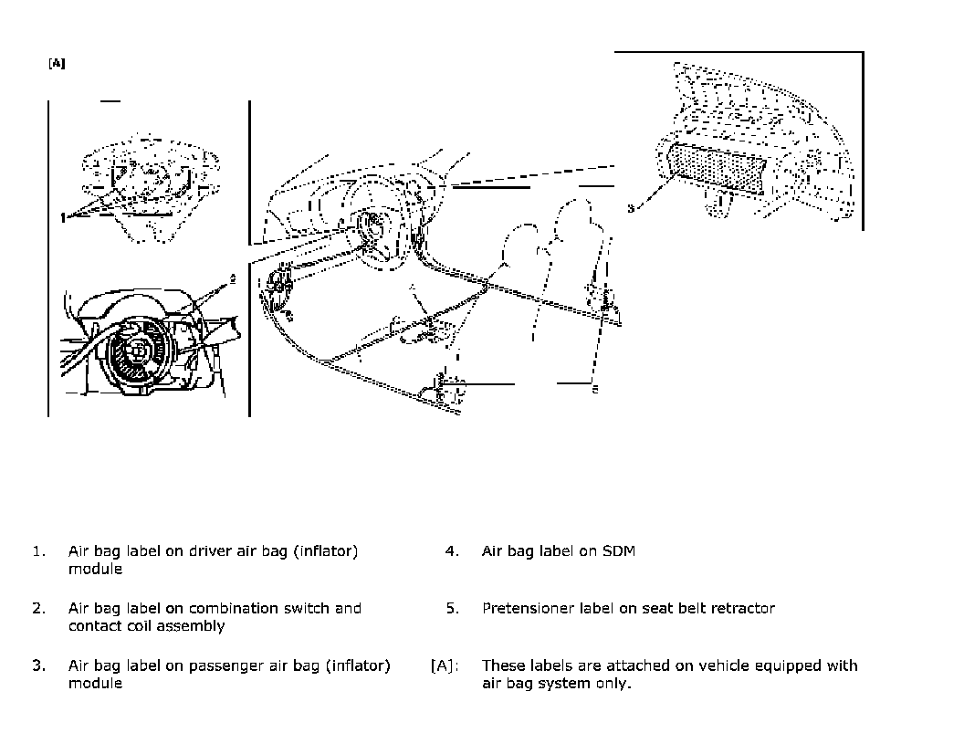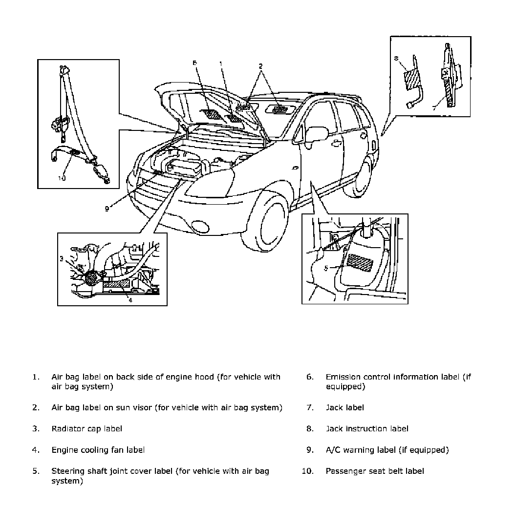 Warning, Caution and Information Labels LocationThe figure shows main labels among others that are attached to vehicle component parts. When servicing and handling parts, refer to WARNING / CAUTION instructions printed on labels. If any WARNING / CAUTION label is found stained or damaged, clean or replace it as necessary.