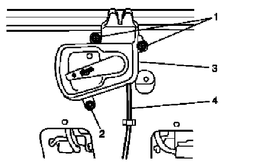 3. Loosen trunk lid latch bolts (1) and clip (2), and remove trunk lid latch assembly (3).