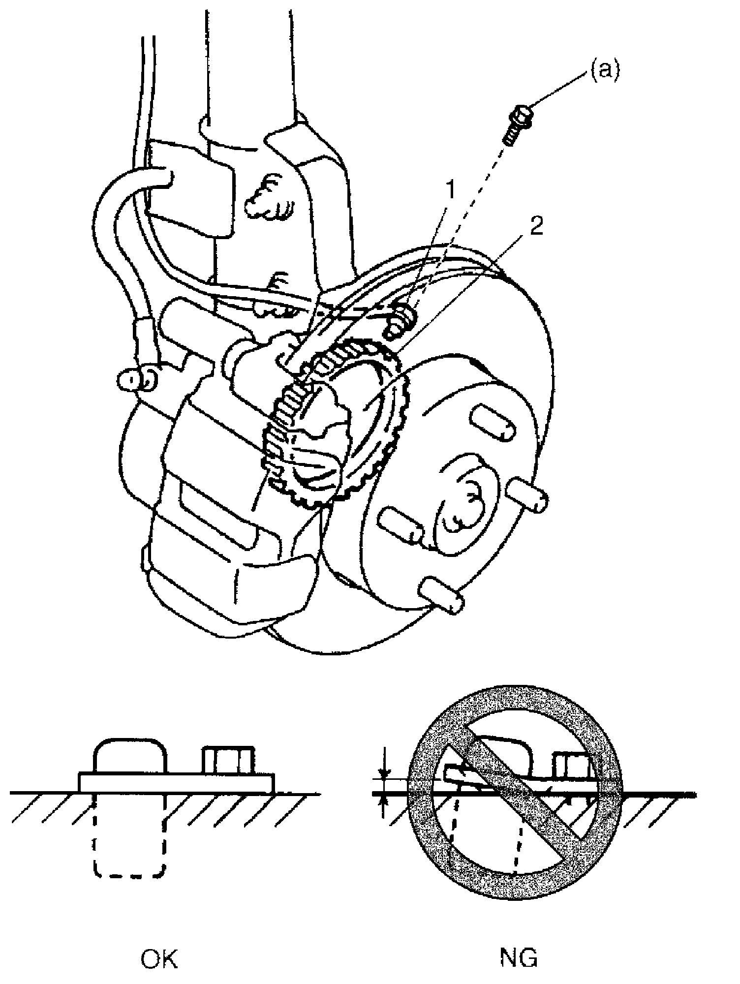 ^ Do not cause damage to surface of front wheel speed sensor and do not allow dust, etc. to enter its installation hole.