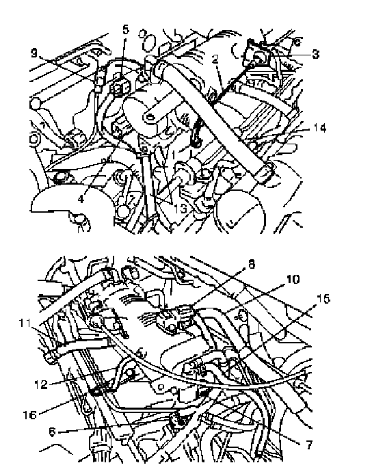 - Fuel pressure regulator vacuum hose (12) from intake manifold